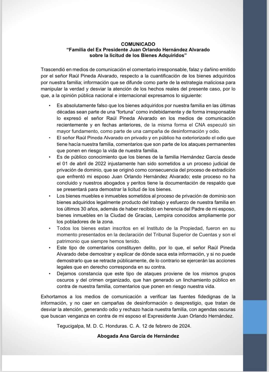 Según el comunicado, la familia Hernández Alvarado califica las declaraciones de Pineda Alvarado como "falsas e irresponsables", destacando que los bienes adquiridos por la familia en las últimas décadas no constituyen una "fortuna". Aseguran que estas afirmaciones forman parte de una estrategia maliciosa para manipular la verdad y desviar la atención de los hechos reales del caso en cuestión.