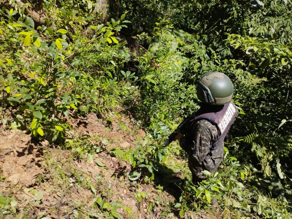 27/03/24. Las Fuerzas Armadas de Honduras, a través del Cuarto Batallón de Infantería y la Dirección de Información Estratégica, en coordinación con la Dirección de Lucha Contra el Narcotráfico (DLCN), identificaron y destruyeron una plantación de 2 mil 500 plantas de coca en la comunidad de San Marcos, municipio de La Masica, Atlántida.