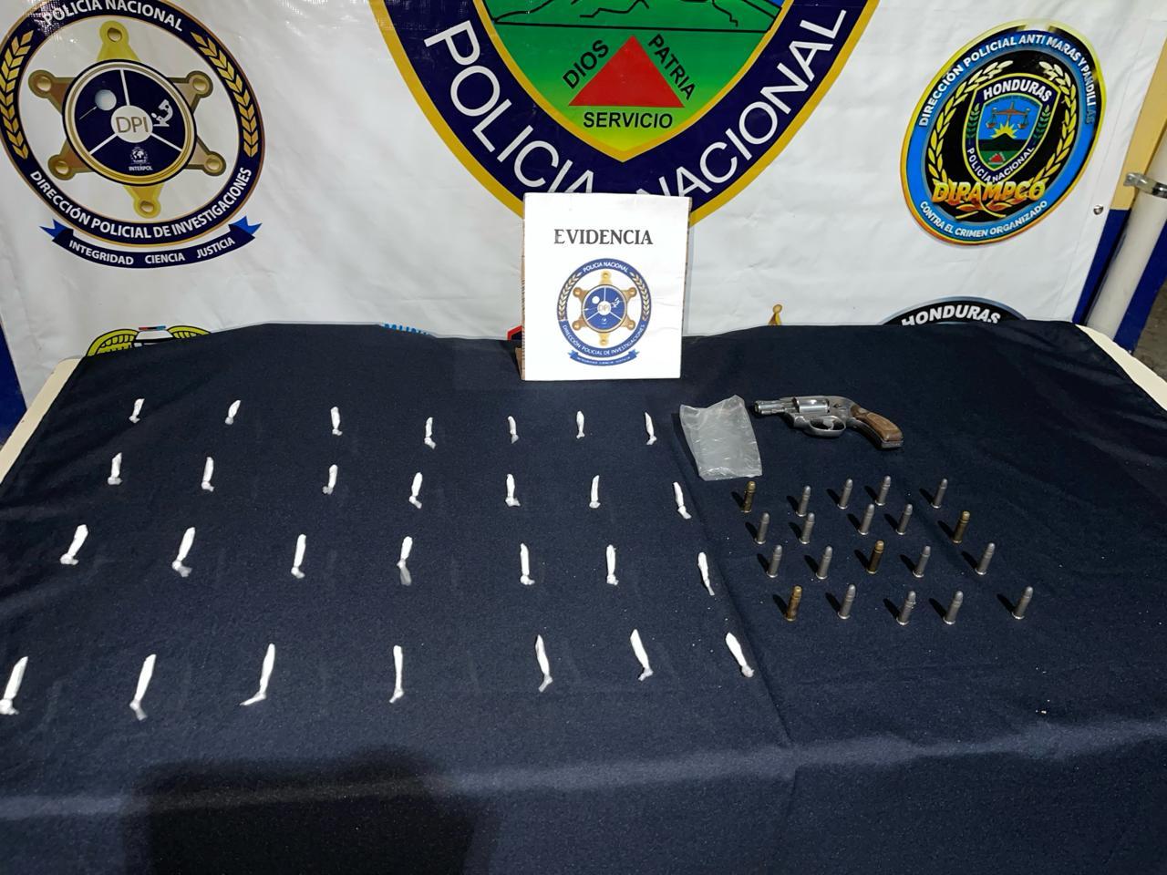 La sospechosa, de 43 años de edad y originaria de San Francisco de Coray, Valle, fue encontrada en posesión de 28 bolsitas de plástico transparente que contenían polvo blanco, supuesta cocaína, con un valor estimado de 4,200 lempiras, así como un arma de fuego tipo revólver de marca Smith & Wesson, y 20 cartuchos sin percutir.